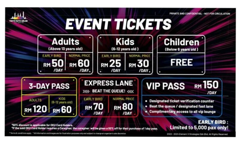 Tiket untuk kanak-kanak berusia 6 hingga 12 tahun pula ialah RM25 untuk early bird, RM30 pada harga acara, dan RM60 untuk pas tiga hari. Kanak-kanak bawah enam tahun masuk percuma.