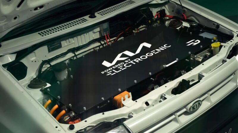 Ini kerana tidak seperti EV moden, Kia Pride EV ini telah dipasang dengan dua unit pek bateri kecil, masing-masing berkapasiti 10 kWh (satu di hadapan dan satu lagi di bawah lantai trunk).