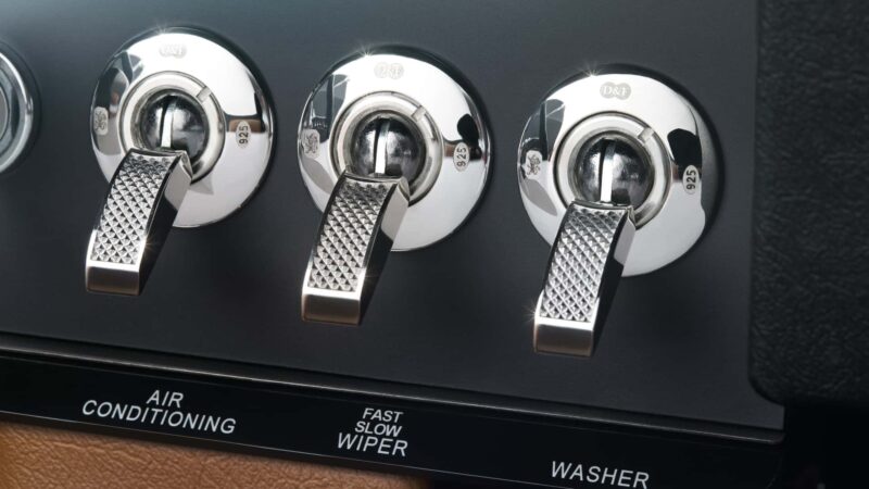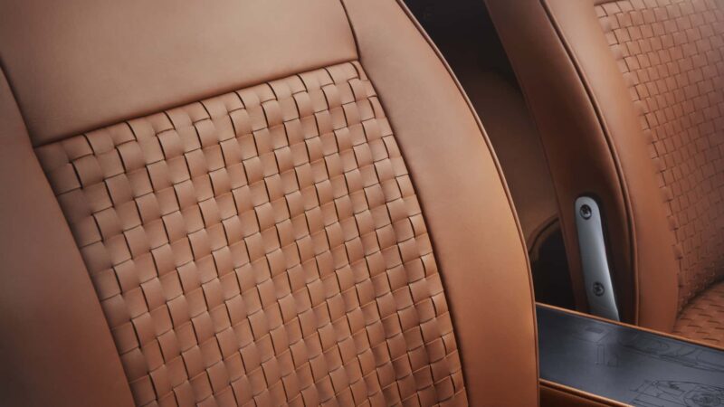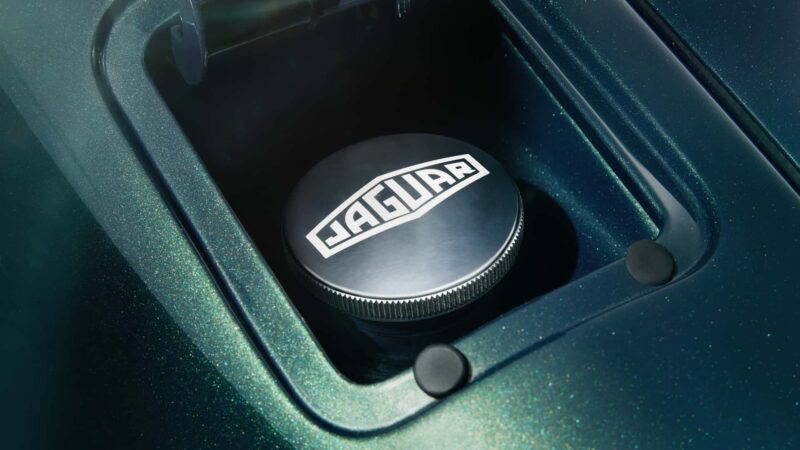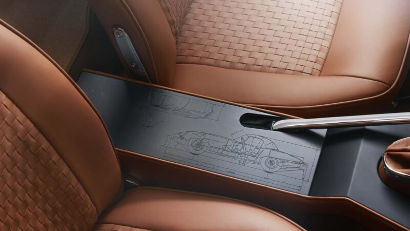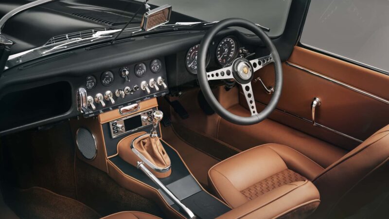 Ruang kabin E-Type ini dihiasi dengan tempat duduk balutan kulit tan Bridge of Weir yang disulam menggunakan tenaga tangan, konsol tengah aluminium dengan ukiran blueprint Series 1, serta kemasan emas dan perak yang dihasilkan oleh Deakin & Francis – pengeluar barang kemas tertua di Britain.