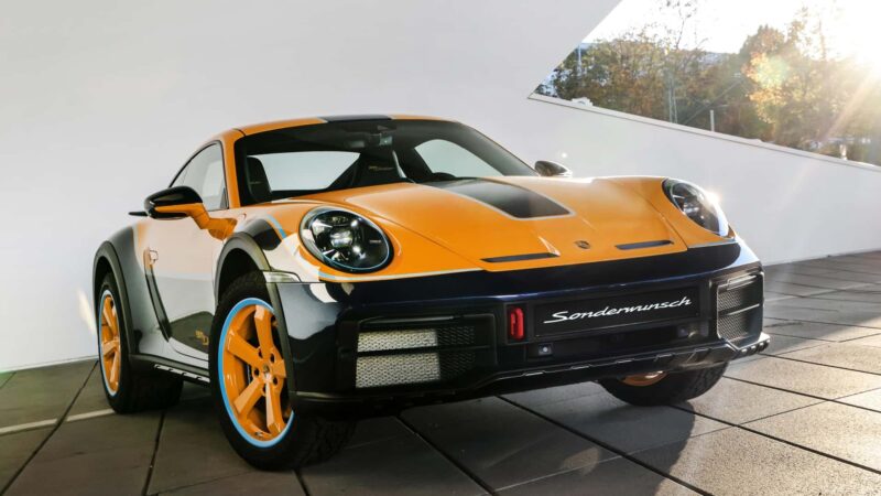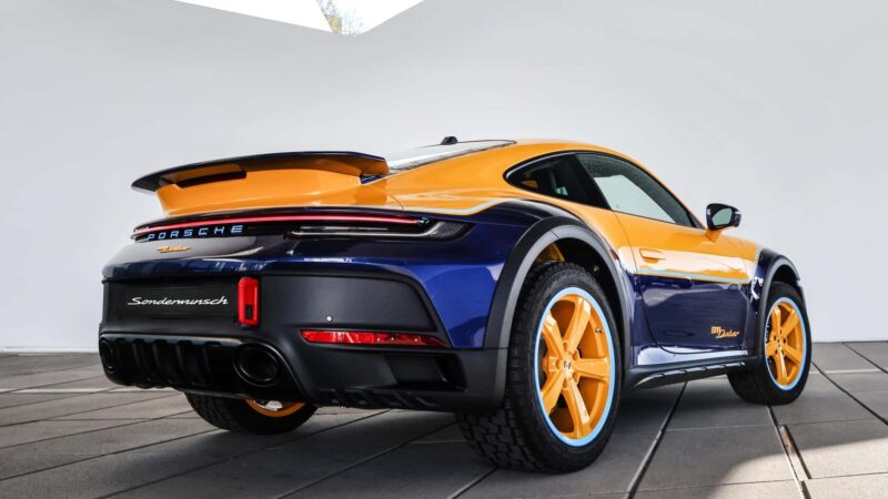 Ya, unit yang anda lihat ini merupakan Porsche 911 Dakar yang ke-2,500, dilayangkan dengan liveri kustom tiga tona seperti yang diminta oleh pemiliknya dari Itali.