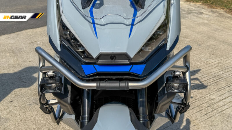 Seperti contoh, terdapat crash bar dan pelindung tangan pada bar hendal, serta lampu kabus dengan beberapa tetapan suluhan tersedia bagi melengkapkan imej skuter ADV yang sangat bergaya.