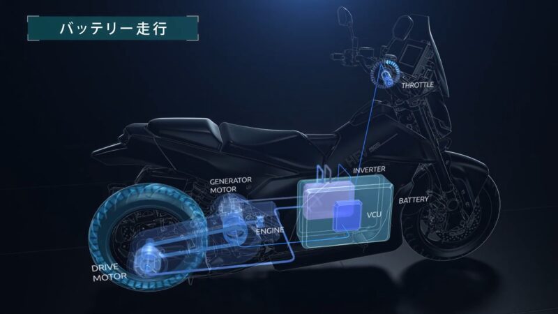Sistem hibrid siri selari ini menggandingkan enjin dengan dua motor elektrik yang dipadankan pada skuter XMAX yang telah diubahsuai.