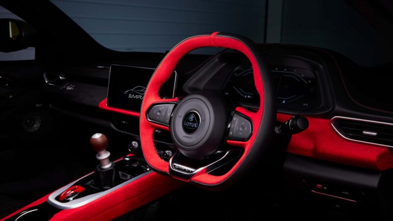Ruang kabin Emira diserikan dengan warna dua tona hitam merah, seperti tema yang digunakan pada jentera Team Lotus era 60-an.
