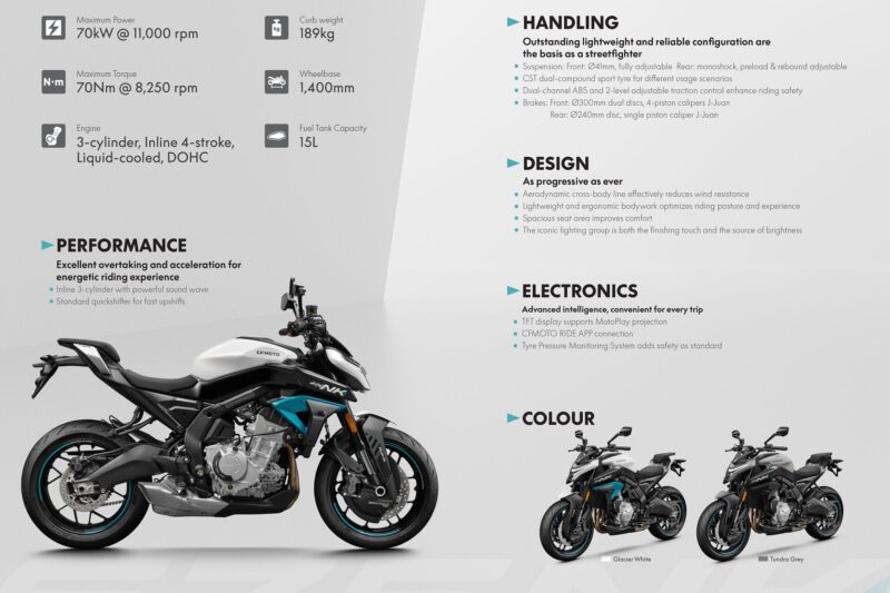 Antara ciri lain termasuklah kawalan cengkaman (TCS) dua tahap, sistem pemantauan tekanan tayar (TPMS), lampu LED, port pengecas USB Type-A dan Type-C, rim 17 inci, serta skrin paparan TFT lima inci yang menyokong aplikasi CFMoto Ride App.