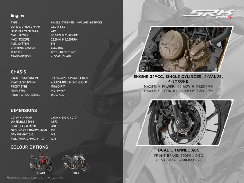 Untuk pasaran Malaysia, QJMotor SRK250S ini dijual pada harga bermula dari RM9,888 tidak termasuk cukai jalan dan insurans.