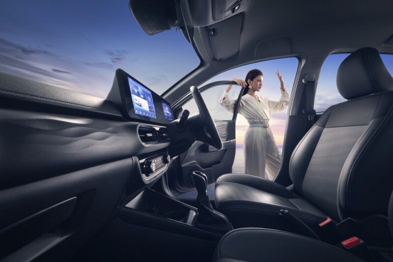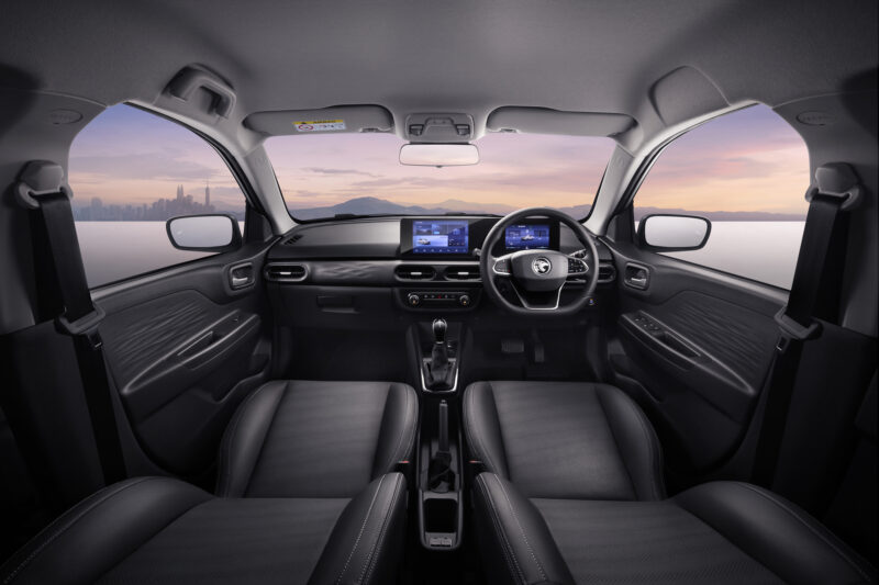 Untuk ruang kabin, terdapat skrin kluster meter tujuh inci, skrin infohibur sebesar 9 inci, sokongan Apple CarPlay dan Android Auto, empat pembesar suara (dua untuk varian Standard), tempat duduk balutan leatherette (fabrik untuk dua varian terendah), dan port pengecasan USB.