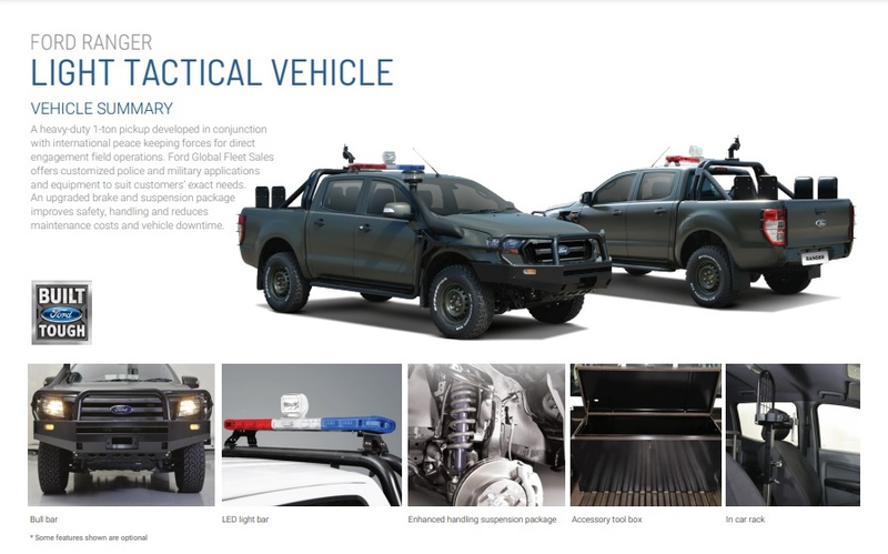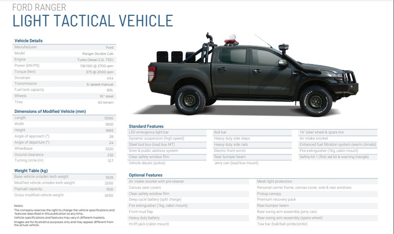 Ford Ranger yang mereka perolehi adalah dengan spesifikasi J97 Light Tactical Vehicle digunakan oleh polis dan pihak berkuasa Afghanistan sebelum ini. Ranger ini bukanlah yang terbaharu, tetapi juga bukanlah versi terlalu lama.