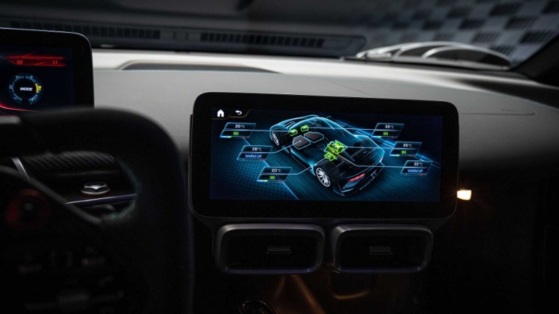Stereng pula adalah berbentuk empat segi seperti F1 sebenar, dengan dua skrin digital 10-inci di papan pemuka. Terdapat juga beberapa corong pendingin hawa dan gril pembesar suara menjadikan F1 ini ‘layak’ dipandu di jalanan.