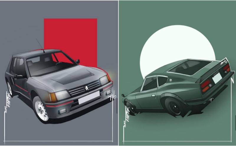 Dihasilkan oleh Sajay Shinu dan dikongsi di laman Instagram beliau, pelbagai model kereta telah dilakar antaranya Mitsubishi Lancer Evo VI, Alfa Romeo 159 wagon, Honda CR-X, Porsche 935 Slant Nose, Volkswagen Golf Mk4 R32, dan kegemaran penulis, Peugeot 205 GTi.