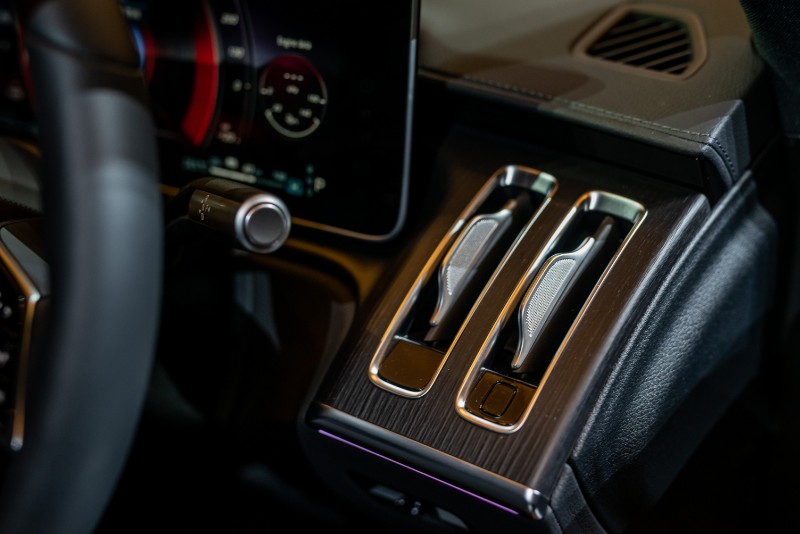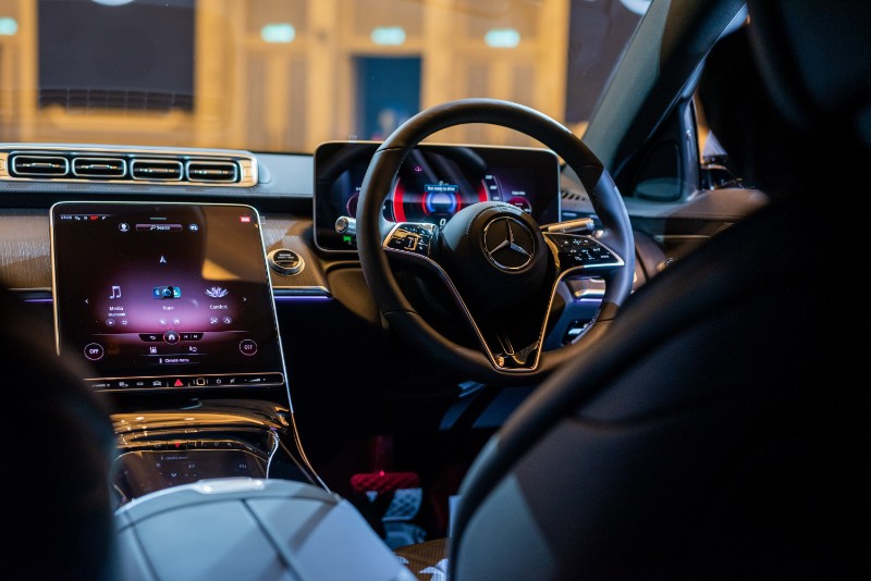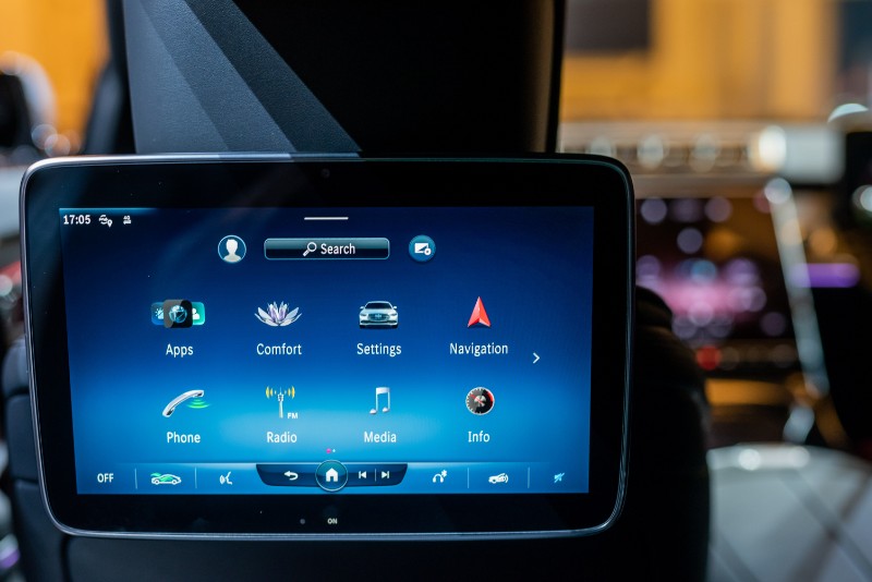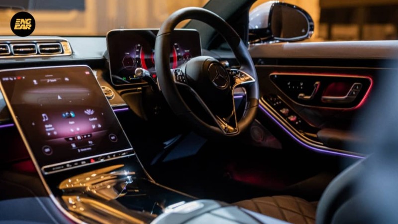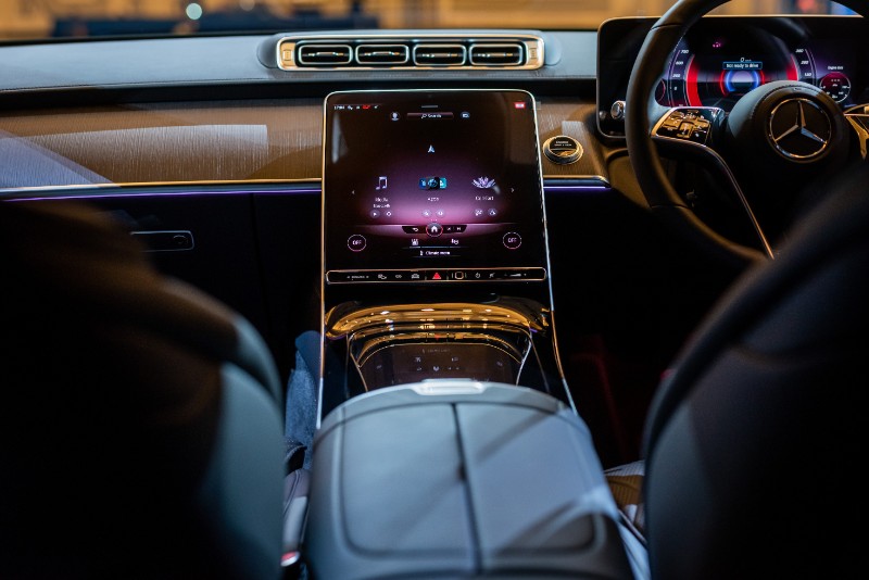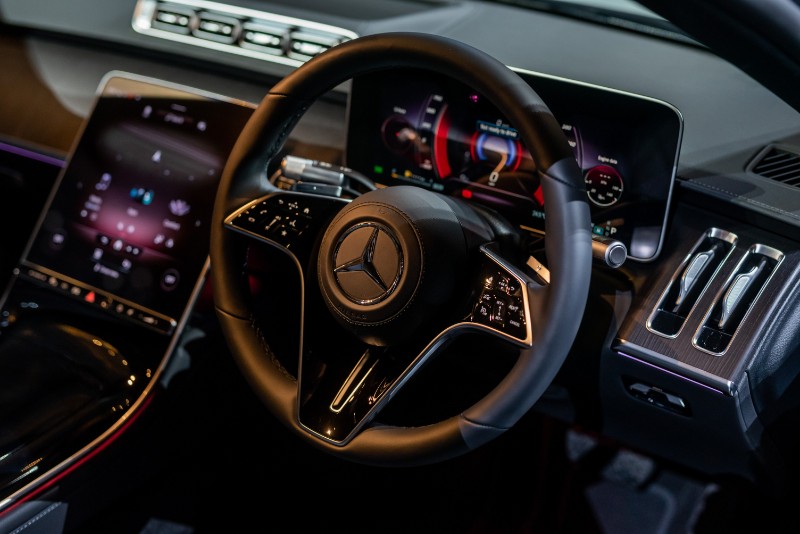 Konsep minimalis diteruskan ke bahagian dalam, dimana S-Class ini menampilkan papan pemuka dengan skrin sesentuh besar di tengah. Jadi di sini terdapat kebanyakan kawalan kenderaan.