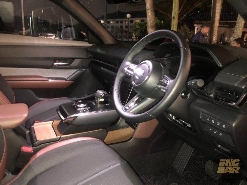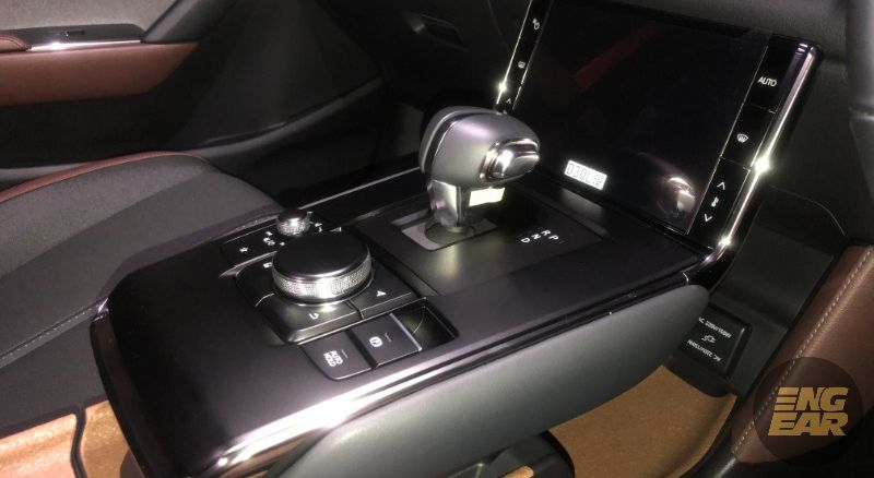 Susun atur ruang kabinnya dilihat tidak jauh berbeza dengan CX-30 dan Mazda3 namun MX-30 didatangkan dengan skrin sentuh tambahan pada konsol tengah untuk kawalan sistem pendingin hawa.