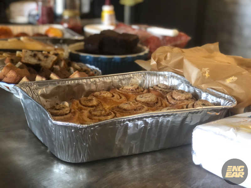 Hidangan lain adalah roti pisang, brownies, dan cinnamon roll, serta pilihan kopi dan minuman ringan.