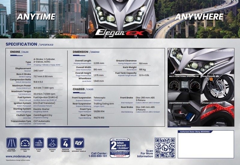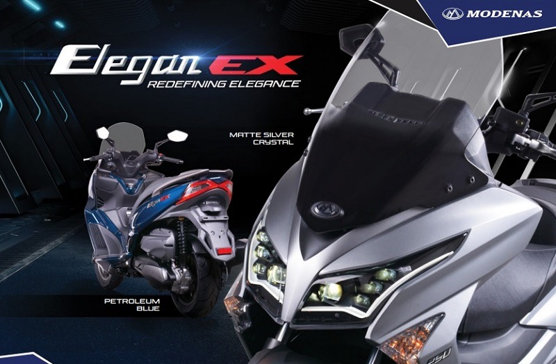Modenas Elegan 250 EX boleh menjadi milik anda dengan harga jualan RM16,997, dan datang dengan dua pilihan warna baharu iaitu Matte Silver Crystal dan Petroleum Blue. Ia juga dilindungi dengan jaminan selama dua tahun atau 20,000km (yang mana dahulu).