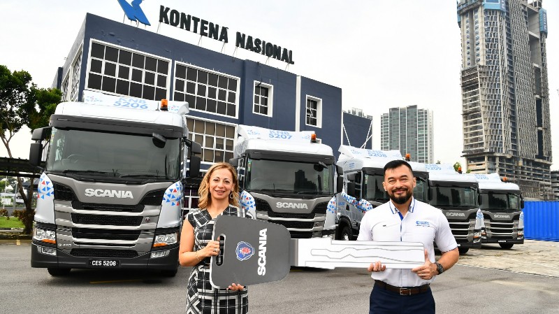 SCANIA menyerahkan 16 unit trak G410A6x2NZ baharu kepada Kontena Nasional (KN), sebahagian dari 46 unit prime mover yang dijangkan diserahkan tahun ini.