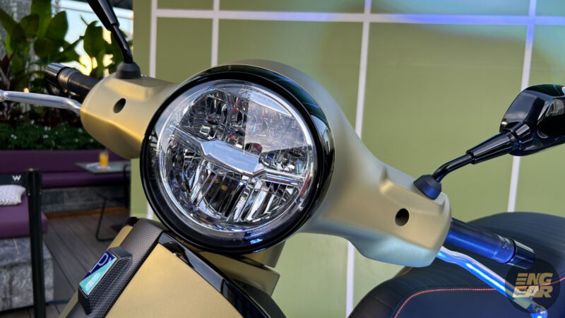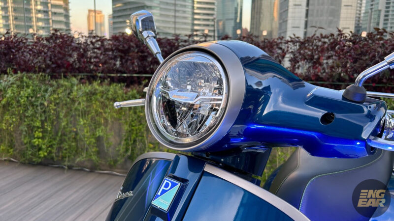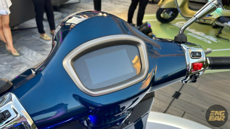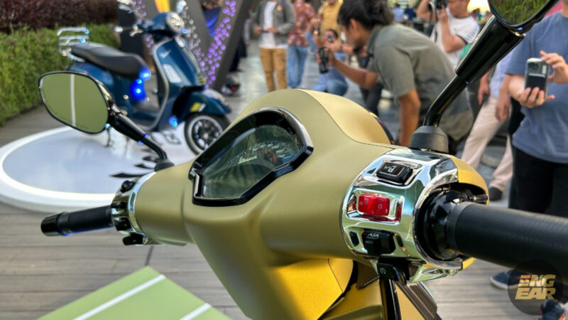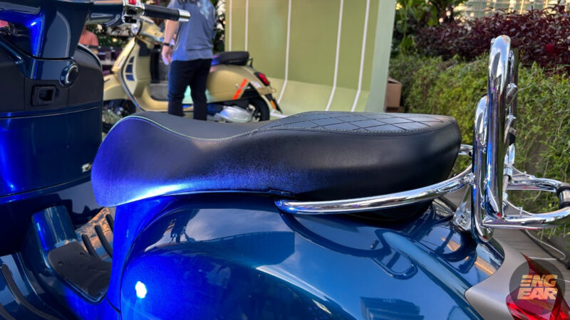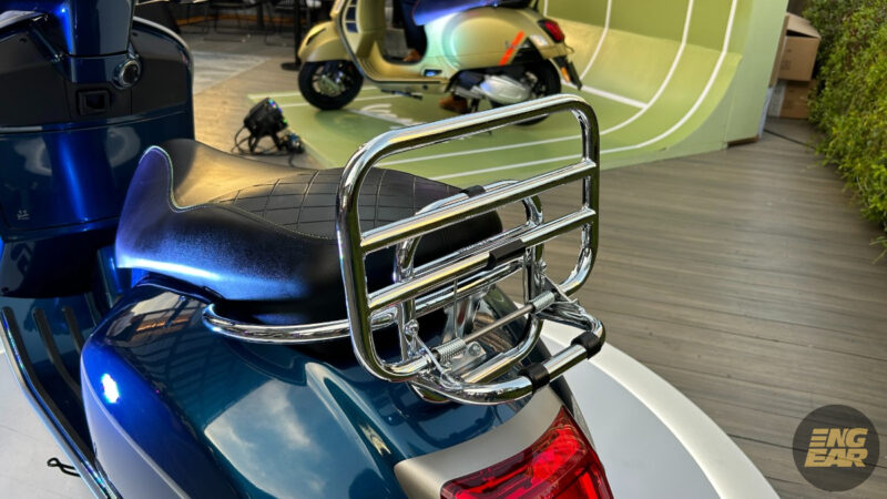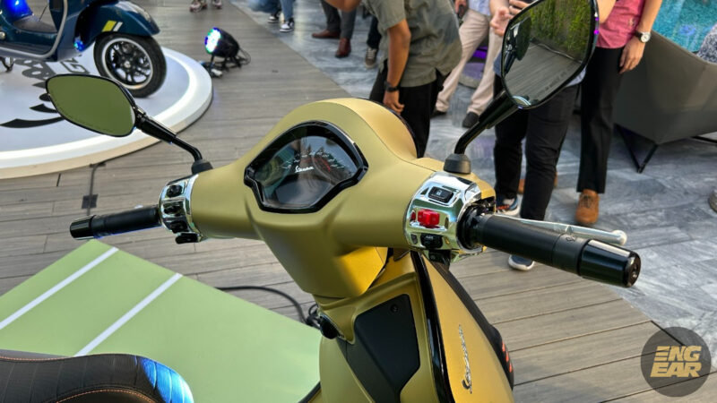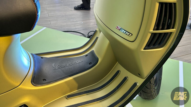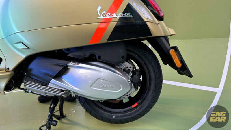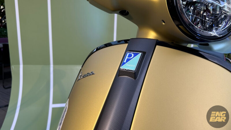 Terdapat juga elemen kontra pada penutup hendal dan spring depan yang diwarnakan dengan hijau neon. Tempat duduk juga diberikan warna seperti “hi-tech”, menurut Vespa.