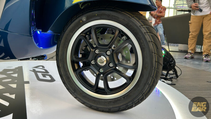 Tayar bersaiz 120/70 R12 di depan, dan 130/70 R12 di belakang. Untuk brek pula, GTS 300 didatangkan dengan cakera 220mm di depan dan belakang, lengkap dengan ABS.
