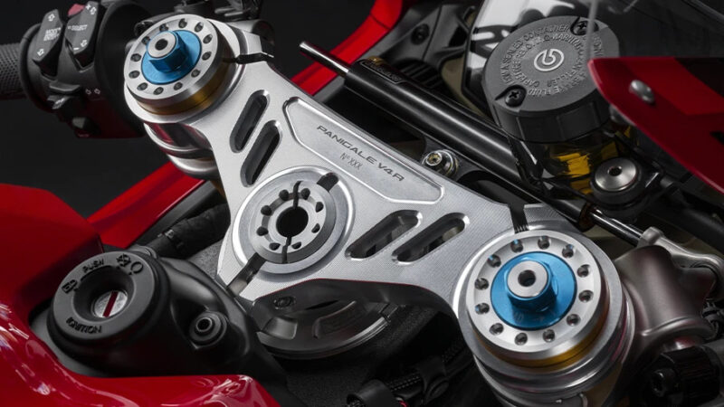 Untuk sistem suspensi, Panigale V4R menggunakan fork Ohlins NPX25/30 dengan tambahan jarak pergerakan (travel) sebanyak 5 mm, serta penyerap hentak Ohlins TTX36 dengan ketinggian pivot lengan ayun yang boleh dilaraskan dalam empat posisi.