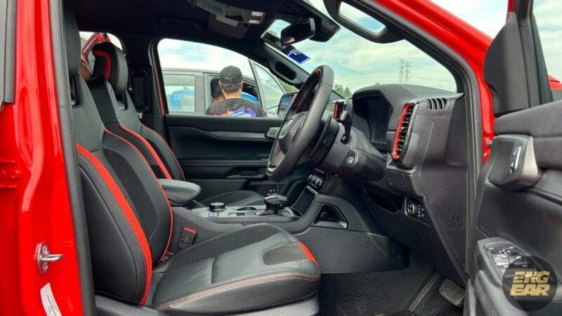 Ciri utama di bahagian dalam termasuklah warna Ebony dengan Code Orange, tempat duduk kulit rekaan jet pejuang, paparan instrumen 12.4-inci, dan sistem infotainmen Ford SYNC 4A dengan sambungan Apple Carplay dan Android Auto.