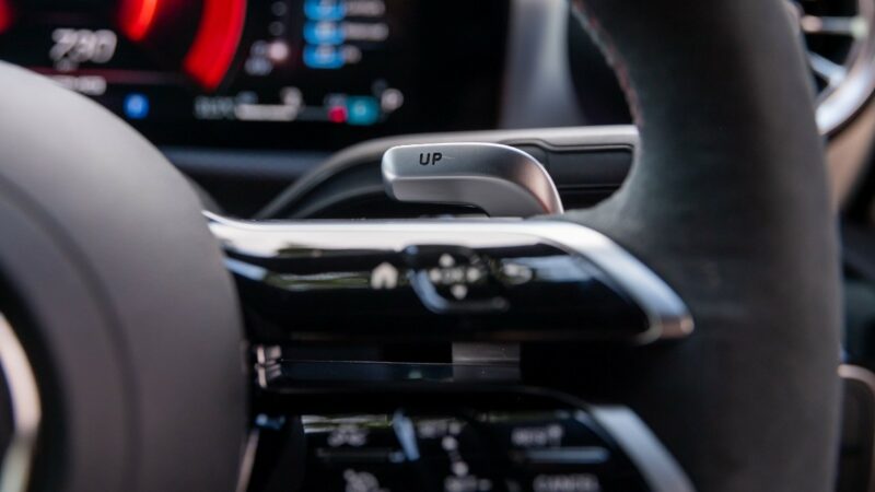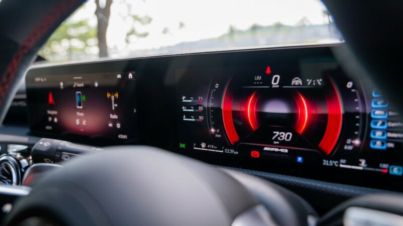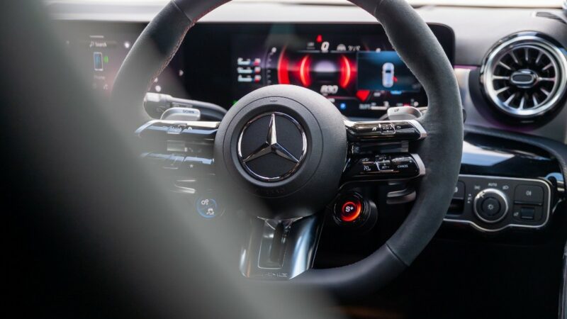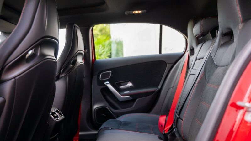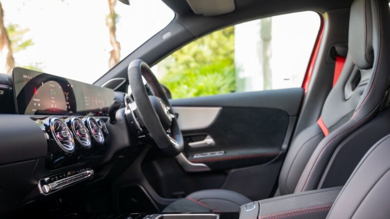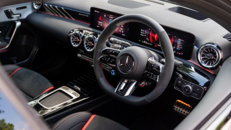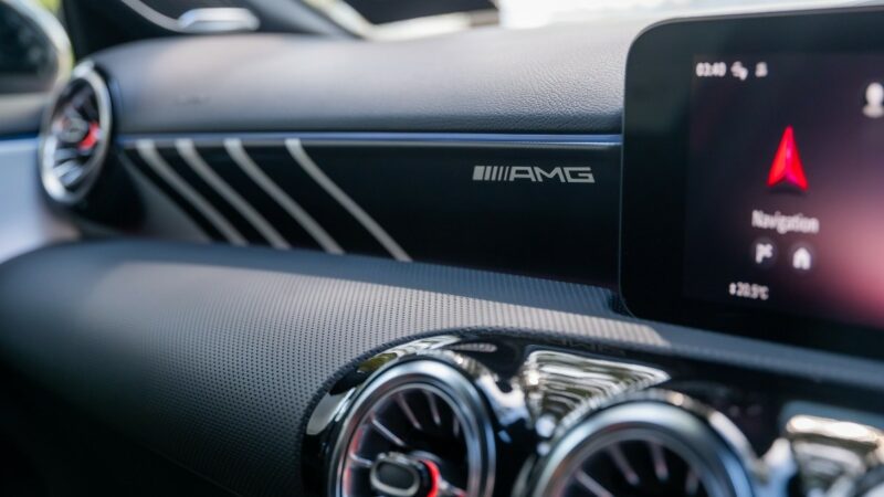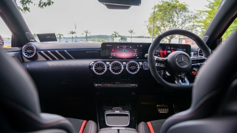Di bahagian dalam pula, A45S mendapat tempat duduk AMG Performance Seat Package Advance, balutan kulit sintetik Artico, balutan Microcut di seluruh kabin, disulami dengan kemasan aluminium AMG.