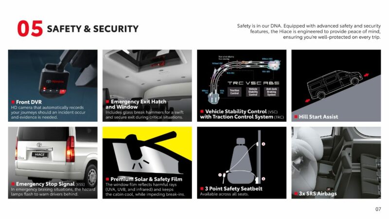 Ciri standard pada Toyota Hiace baharu ini termasuklah tali pinggang keledar 3-poin untuk semua tempat duduk, lampu di pemijak sisi pintu gelungsur, DVR (dashcam), dua soket kuasa, RFID binaan dalam, ruang keluar kecemasan di bumbung, tiga beg udara, dan Emergency Stop Signal (ESS).