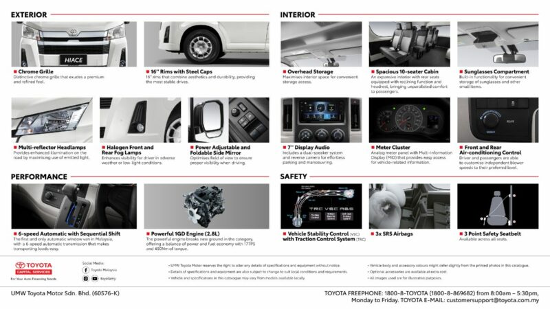 “Kami telah menerima banyak permintaan dari rakan kongsi niaga kami berkenaan Hiace baharu ini. Dengan pengenalan model SLWB ini, kami berbesar hati menawarkan kenderaan yang menepati keperluan dari segi ruang, kuasa, dan keselesaan buat pelanggan kami,” kata Datuk Ravindran K., Presiden UMWT.