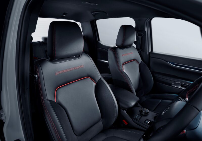 Di dalam, anda akan menemui jahitan kontras berwarna Race Red dan logo StormTrak pada tempat duduk dan papan pemuka, kemasan Suede Miko dan tombol gear e-shifter.