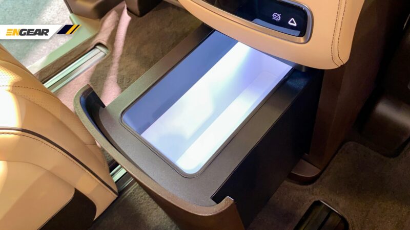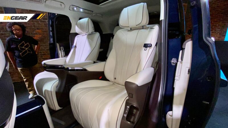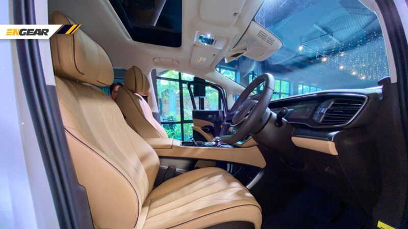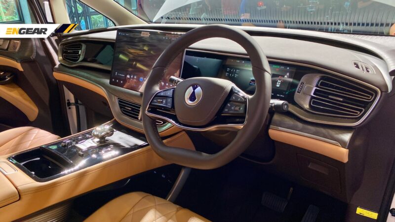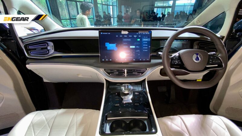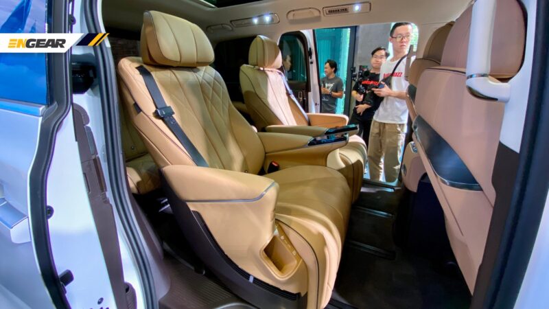Di dalam, MPV elektrik itu mampu memuatkan sehingga tujuh orang penumpang (dengan ketinggian sehingga 180 cm) dengan konfigurasi tempat duduk 2-2-3 yang menampilkan kerusi kapten di barisan kedua.