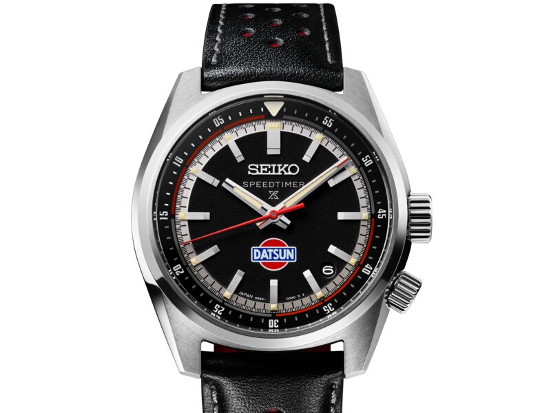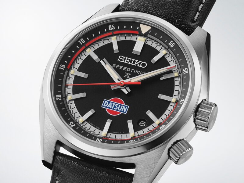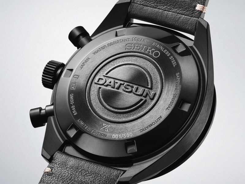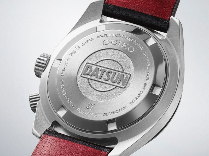 Jam tangan SPB517 menampilkan logo klasik Datsun pada bahagian dial dan penutup belakang.