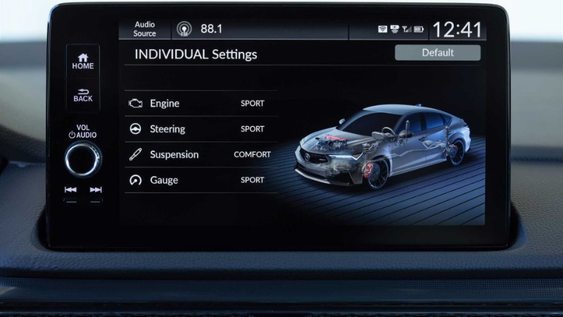 Sistem suspensi menampilkan penyerap hentak adaptif dengan mod Comfort, Sport, dan Sport+. Sementara itu, bar anti-oleng depannya berukuran 1.14-inci, iaitu 0.08-inci lebih tebal dari Integra biasa.