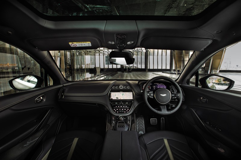 Untuk ruang dalaman, DBX707 AMR23 Edition menggunakan jahitan kontras Lime untuk menaikkan seri upholsteri yang didatangkan dalam warna Onyx Black/Eifel Green. Kemasan gentian karbon dan satin gelap menghiasi konsol tengah, manakala logo AMR23 pula diletakkan pada ambang pintu.