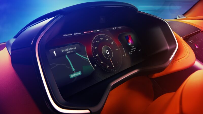 Bahagian dalamannya mengekalkan kemewahan dengan sentuhan perlumbaan. Pemutar mod pemanduan berwarna merah menjadi titik fokus, sepadan dengan tali pinggang keledar dan jahitan kontras dalam warna yang sama.
