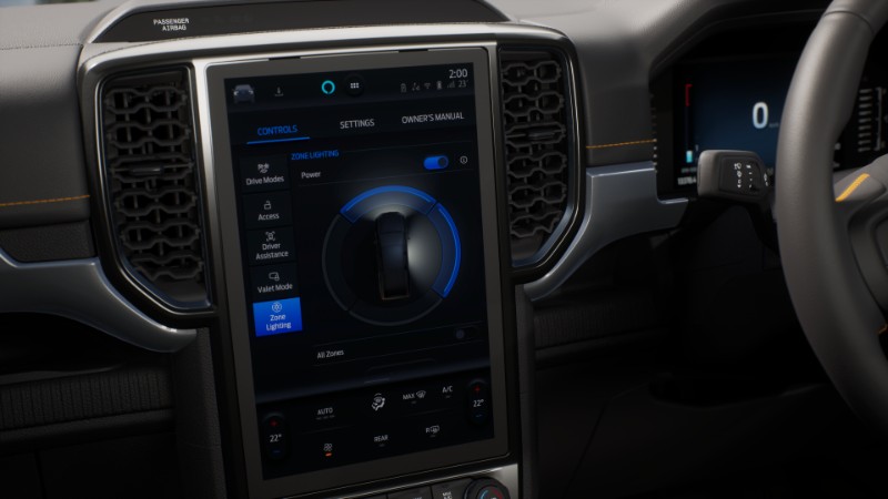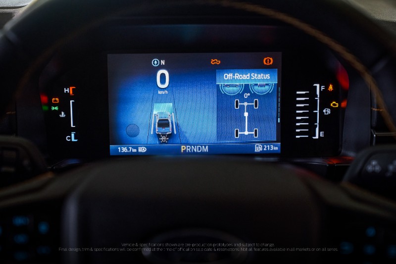 Selain itu, Ranger generasi baharu juga memiliki skrin off-road khusus dalam sistem infotainmen SYNC4A®. Dengan hanya menekan satu butang, anda boleh mengakses skrin off-road SYNC4A® yang menunjukkan tetapan differential lock dan kofigurasi pacuan, sudut kemudi roda, sudut roll and pitch, serta kamera depan dengan garis panduan.