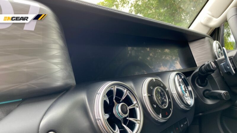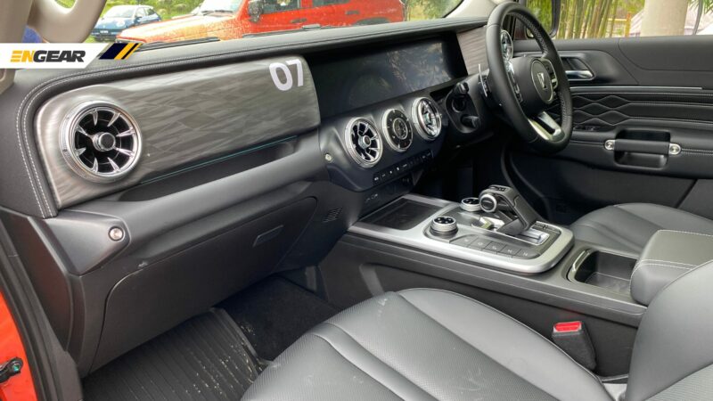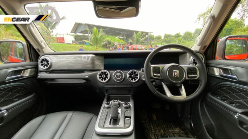 Bahagian dalam, anda akan perasan yang kelengkapannya agak premium, mungkin diinspirasikan dari Mercedes G-Class. Dengan papan pemuka menegak, corong udara turbin, pemegang di depan penumpang, dan sepasang skrin bersaiz 12.3-inci setiap satu.