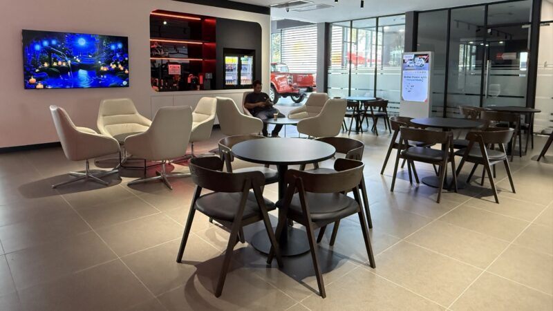 Antara kemudahan yang disediakan di pusat 3S Isuzu ini termasuklah ruang pameran, ruang menunggu seakan sebuah kafe yang lengkap dengan meja, peti sejuk dan mesin kopi, serta laluan berbumbung untuk pelanggan servis.