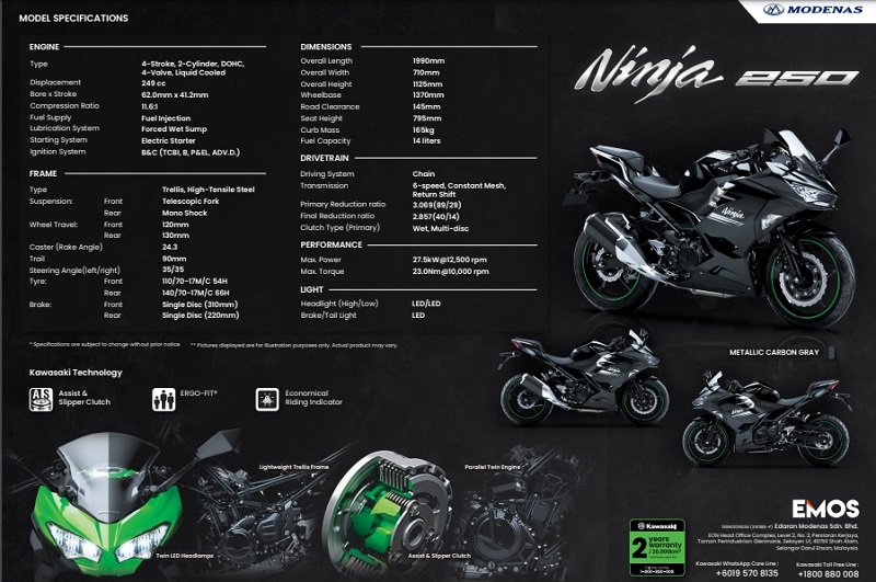 Tiada perubahan lain pada sportbike ini, ia berasaskan model Ninja 250 ABS yang dikuasakan oleh enjin 249cc dua-silinder sebaris dengan output 37hp pada 12,500rpm dan 23Nm tork pada 10,000rpm.