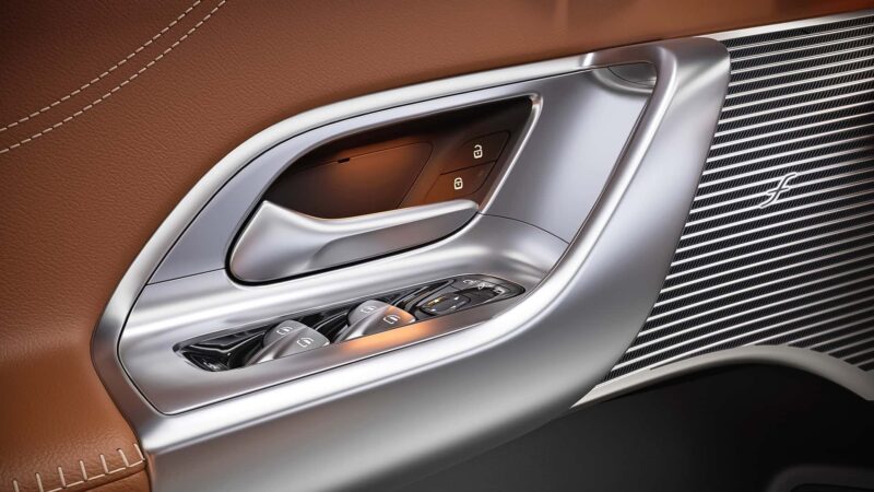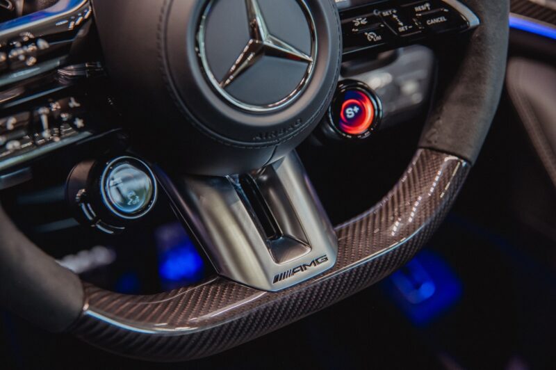 Ruang dalaman yang mewah diserlahkan lagi dengan upholsteri kulit Nappa berwarna hitam yang dipadankan dengan trim gentian karbon, serta stereng gentian karbon AMG Performance.