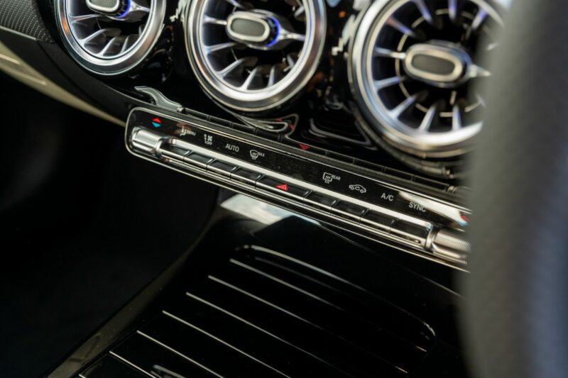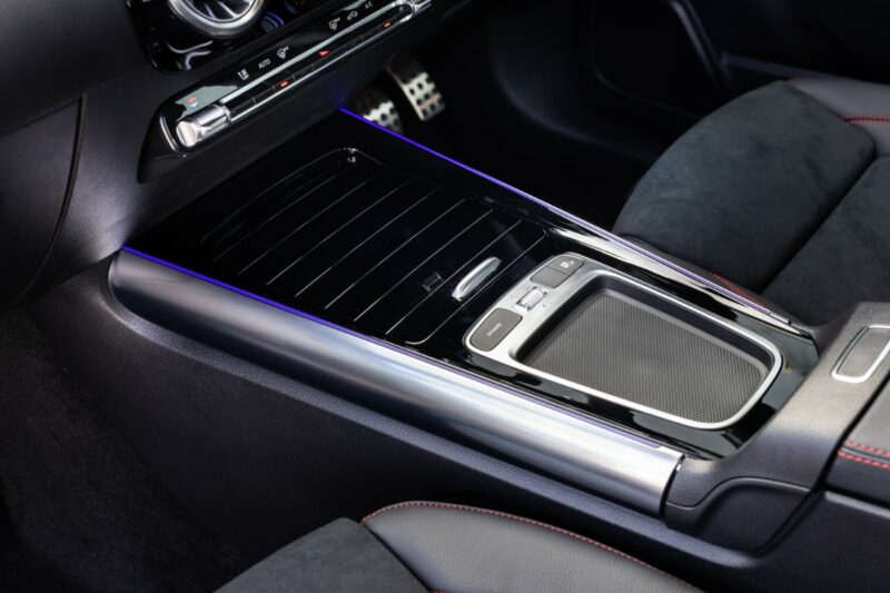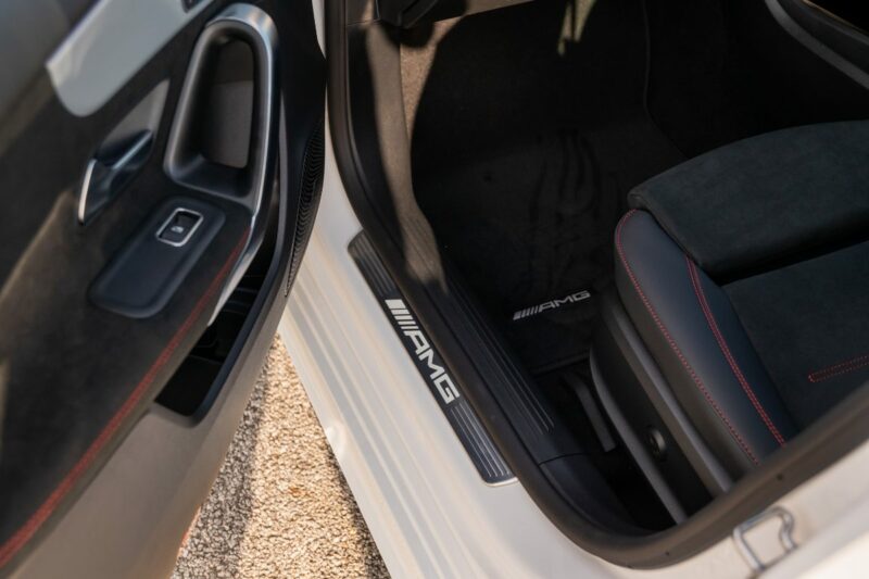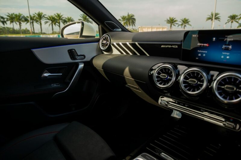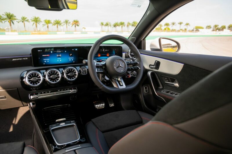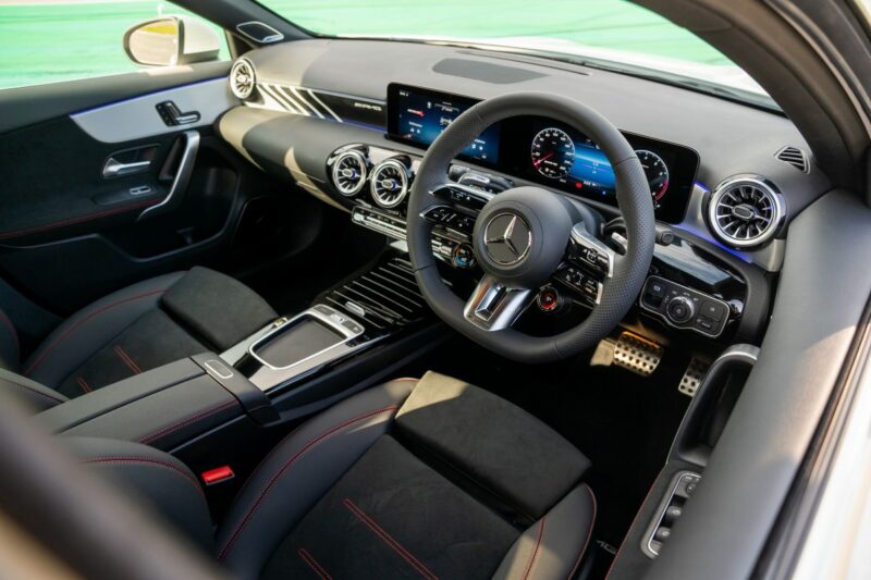 Di dalam kabin, sedan kompak sporti ini dilengkapi dengan roda stereng berserta suis AMG Dynamic Select, panel sesentuh pada stereng, balutan kulit Nappa, tempat duduk sports, kemasan AMG Design berwarna hitam dan perak, tali pinggang merah, lampu ambien 64 warna, dan pemijak sisi menyala.