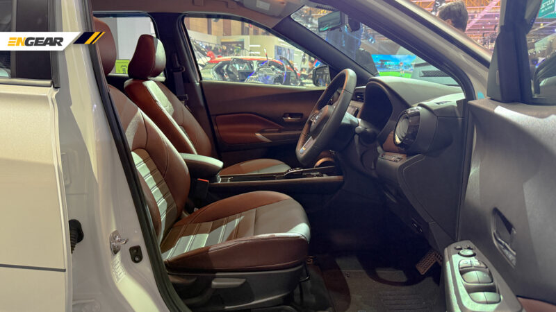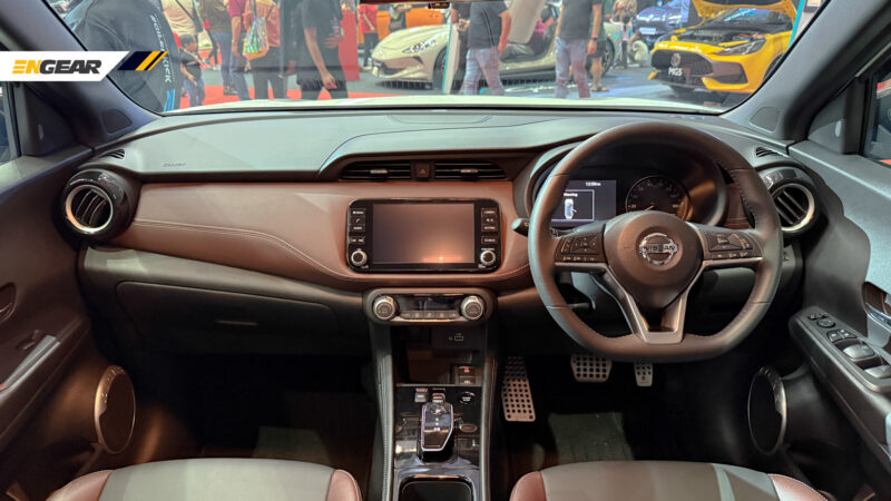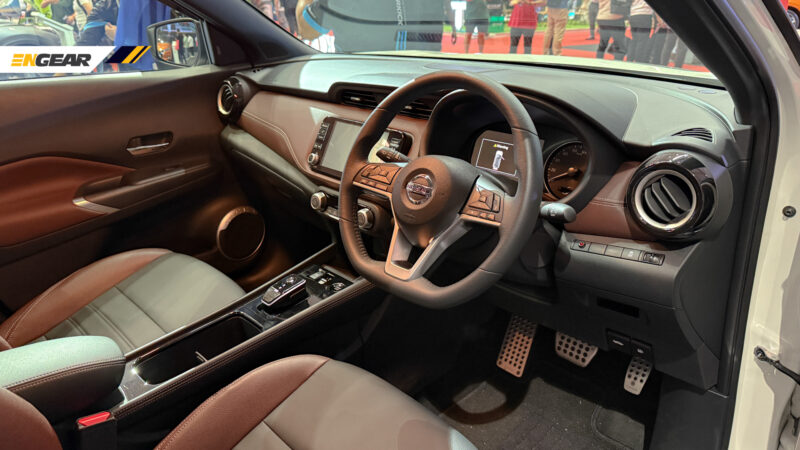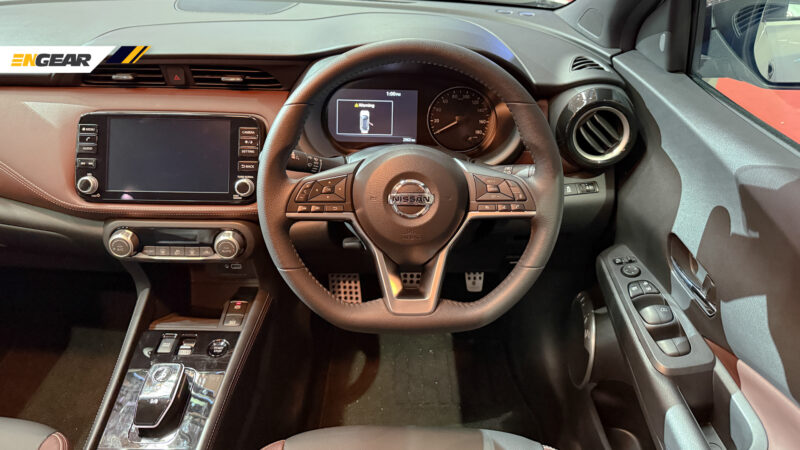 Ruang dalaman menampilkan kulit berjahit corak berlian khas NISMO dalam warna arang dengan jahitan merah, tempat duduk hadapan dengan penyokong sisi boleh laras, pedal aluminium, dan pencahayaan ambien berbilang warna.