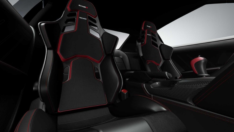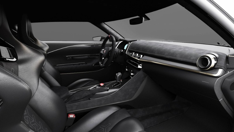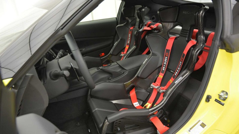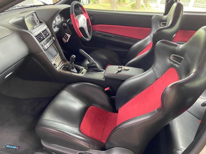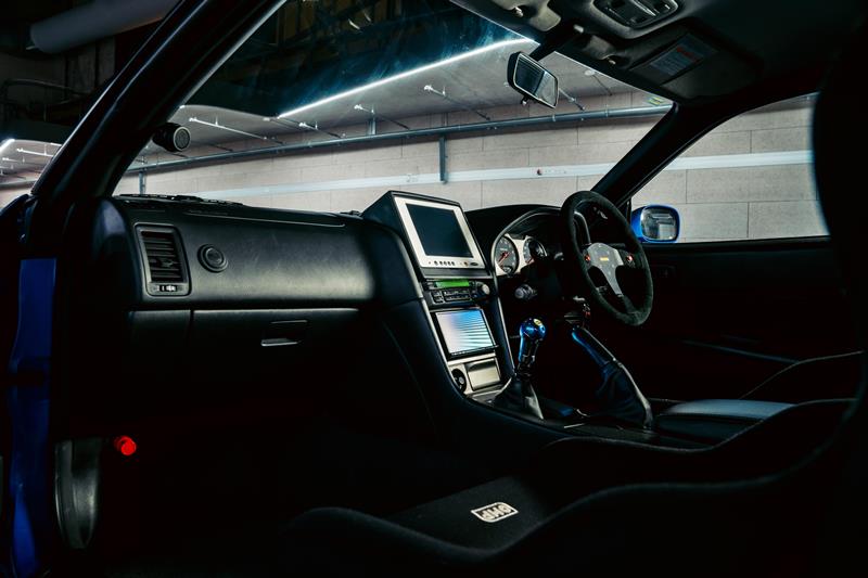 Di dalam, anda akan menemui roll cage kustom, stereng Momo dengan balutan Alcantara, pedal Nismo V-Spec, paparan head-up kustom dan kerusi OMP dengan tali pinggang keledar lima poin. Tempat duduk belakang telah dikeluarkan.