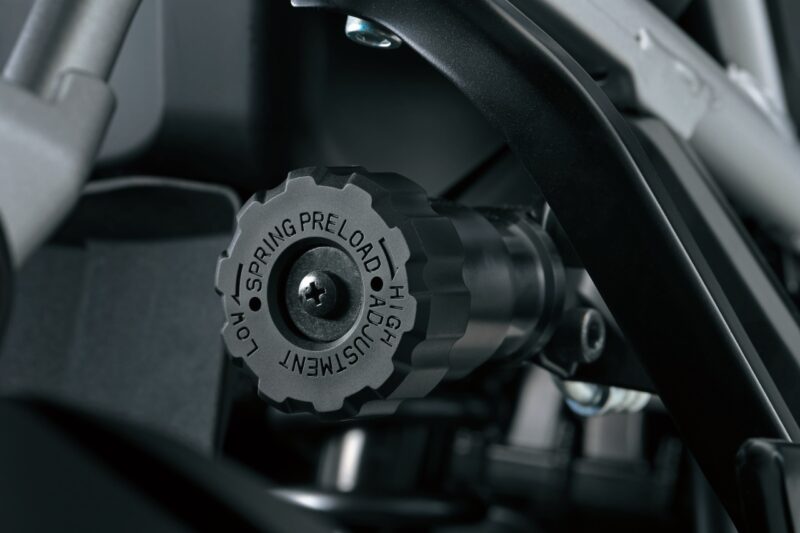 Untuk sistem suspensi, V-Strom 800DE menggunakan sistem keluaran Showa dengan stroke dan jarak gerak (travel) yang lebih panjang pada bahagian depan dan belakang – 220 mm.
