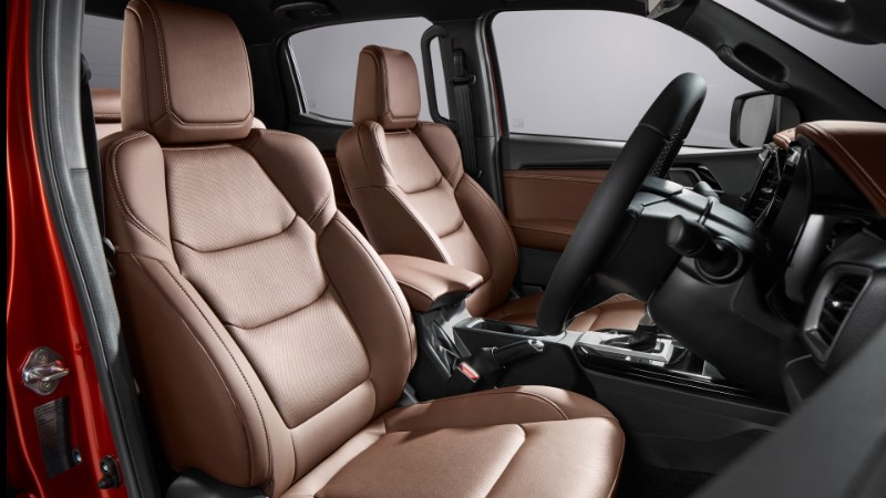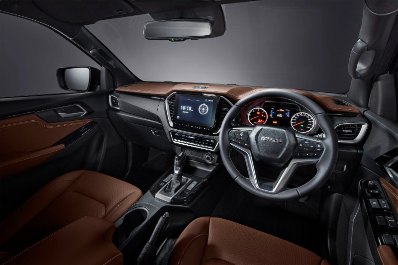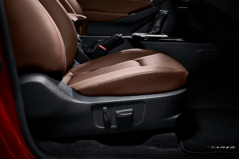 Untuk keju pula, kita merujuk kepada kabin trak pikap ini. Untuk Isuzu D-MAX X-Terrain, kabinnya kini lebih mewah. Atas papan pemuka ada warna berbeza yang nampak cantik dan premium. Kemudian, banyak balutan kulit pada tempat duduk dan roda stereng.
