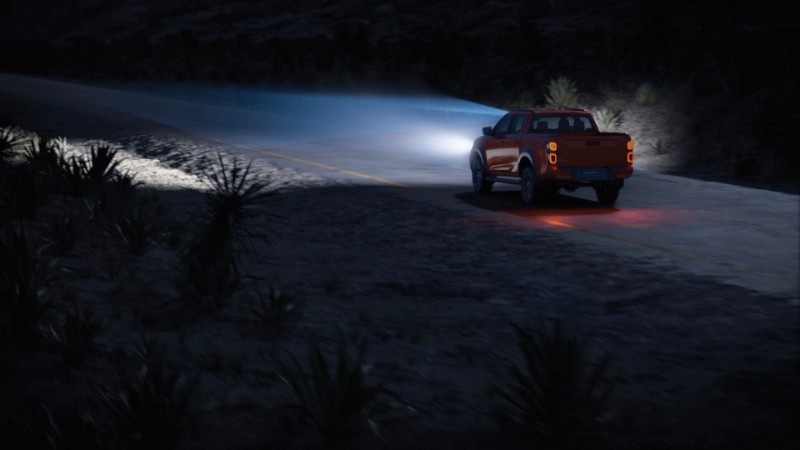 Lampu nyalaan siang LED berbentuk L itu sengaja direka seakan renungan mata helang yang tajam, sementara lampu belakang dengan grafik berbentuk T itu menonjolkan lagi kelebaran trak pikap ini.