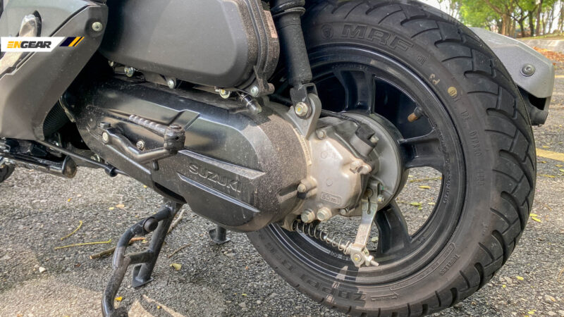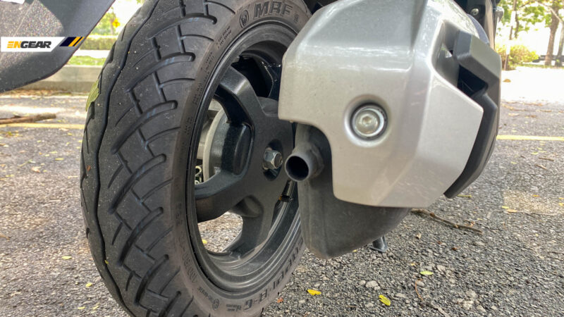Tayar standard MRF bersaiz 90/90 depan dan 100/80 belakang juga menawarkan kadar cengkaman yang bagus baik di atas jalan kering atau jalan basah.