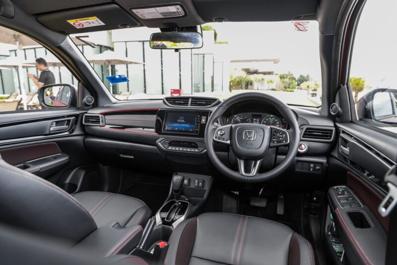 Namun begitu, kehadiran upholsteri kulit pada tempat duduk, papan pemuka sebelah penumpang dan perehat tangan, stereng multifungsi dengan balutan kulit serta trim hitam berkilat dilihat menaikkan seri kabin WR-V.