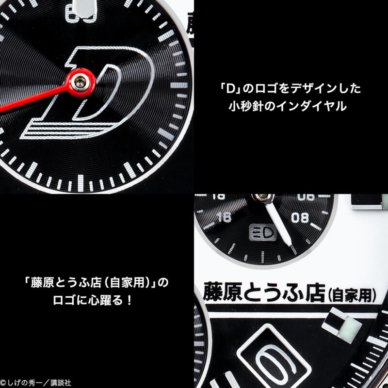 Jam tangan chronograph itu dihiasi dengan tema Initial D, seperti contoh muka jam mengikut kombinasi warna kereta AE86 yang dipandu watak utama Takumi Fujiwara.