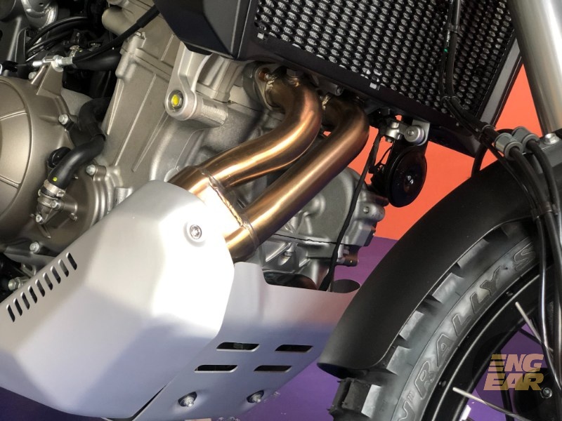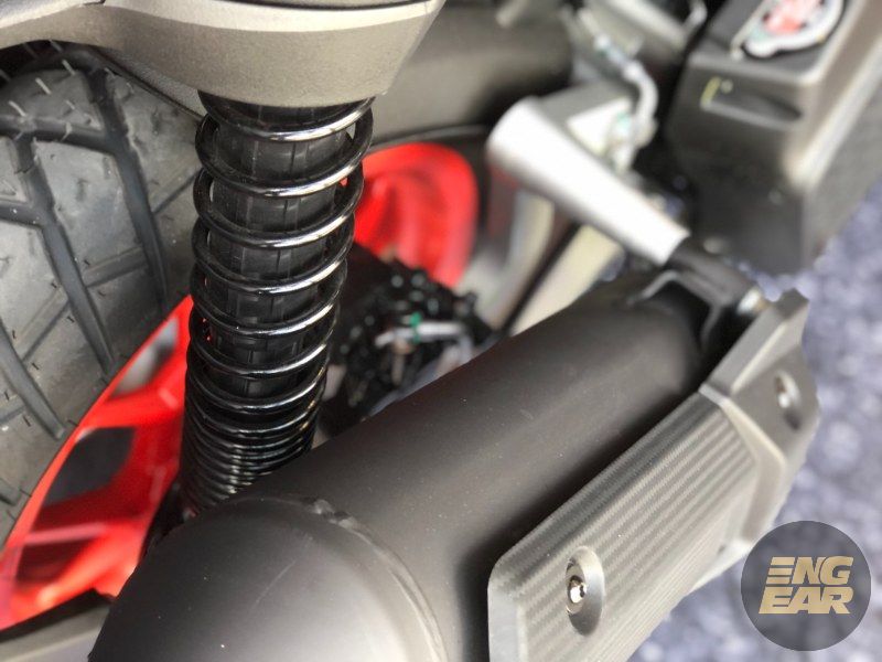 Untuk sistem suspensi, ia menggunakan fork teleskopik 33 mm di depan dan penyerap hentak berkembar di belakang dengan pelarasan pre-load.
