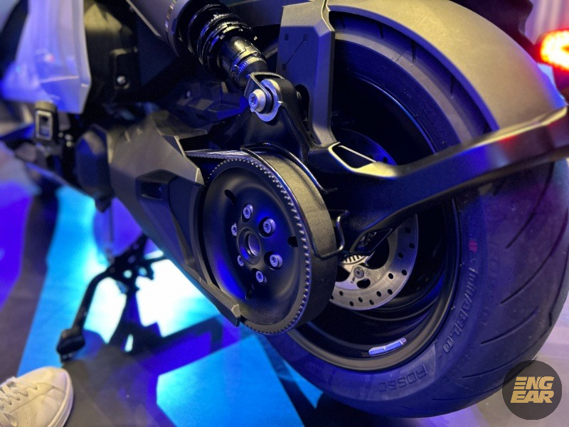 Output disalurkan ke roda belakang melalui lengan ayun tunggal dengan tali sawat bergigi dan transmisi tetap.