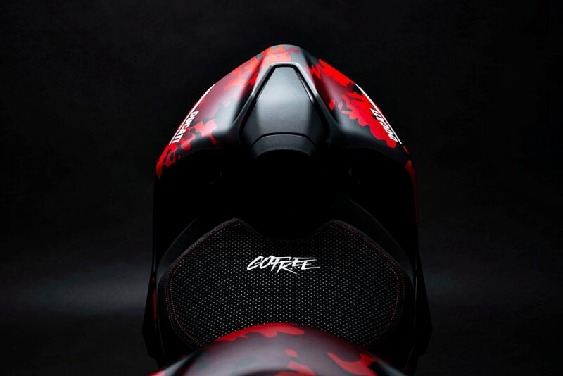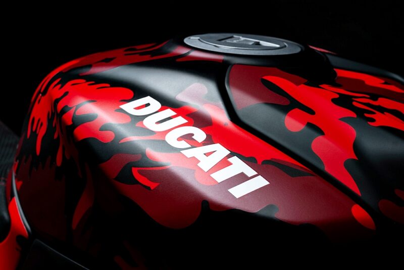 - Menghasilkan semula corak penyamaran hitam dan merah yang terdapat pada topi keledar, sarung tangan dan but Pecco Bagnaia.