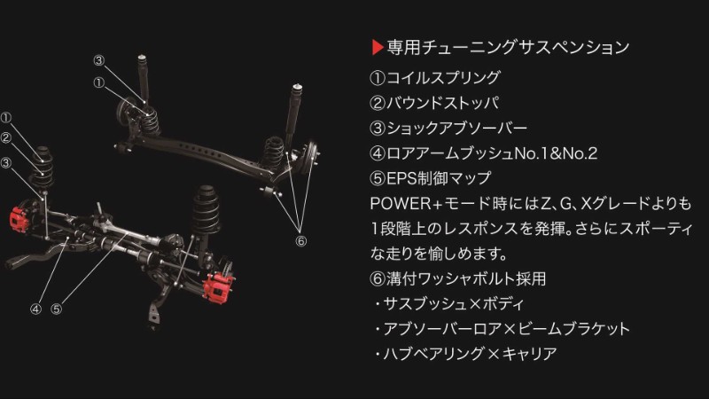 Jurutera Gazoo Racing juga telah menambah bar penguat tambahan di bawah lantai dan mengukuhkan lagi bampar belakang untuk lebih kestabilan semasa selekoh di kelajuan tinggi. Mod Power+ memberikan respon stereng lebih baik untuk menjadikan Aqua lebih lincah.