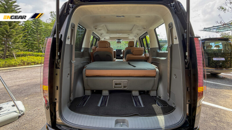 Bergantung kepada varian, Staria juga turut dilengkapi dengan ciri seperti bumbung kaca panorama berkembar, tempat duduk Premium Relaxation, kawalan iklim automatik, skrin sentuh 8 inci, sistem audio Bose dengan 12 pembesar suara, dan ruang kargo sebesar 431 liter.